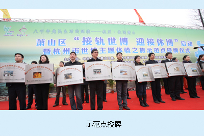 据悉,长三角世博主题体验之旅推广活动由上海、江苏、浙江两省一市共同参与,旨在为世博会中外游客策划提供旅游产品,在主题展馆以外诠释“城市,让生活更美好”的世博主题,展示长三角优美的自然环境和深厚的文化底蕴。经2008年、2009年两轮评选,杭州市有10个示范点28处体验点入选世博主题体验之旅。其中,我区的“八千年先民生活的延续”入选示范点,湘湖、跨湖桥文化遗址、极地海洋公园、东方文化园、钱江观潮等5个景点入围体验点。